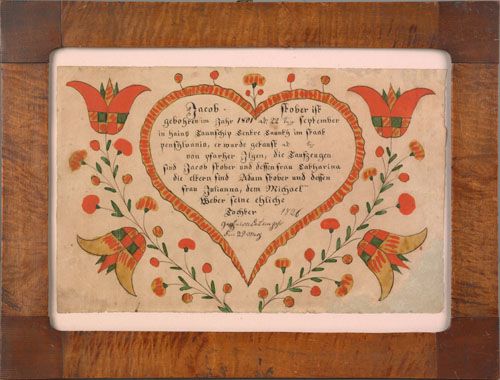| fraktur for Jacob Stover born 1801 with typical central heart surrounded by tulip vines in yellow, red, and green | |