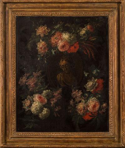 | A still life of a garland of flowers, surrounding a portrait of a young lady | |