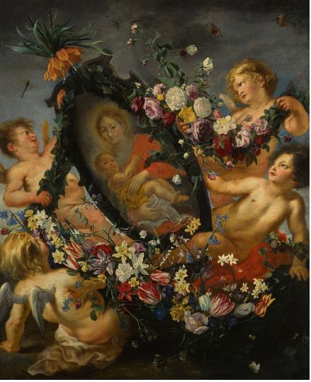 | THE VIRGIN AND CHILD IN A CARTOUCHE SUPPORTED BY CHERUBS, SURROUNDED BY FLOWER GARLANDS | |