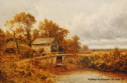 Autumnal scene of a watermill and bridge with storm clouds gathering to the distance