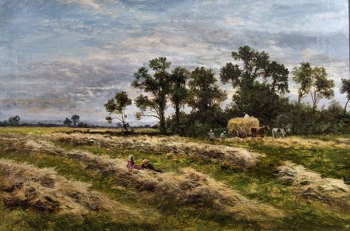 | Landscape - Hayfield - Field of cut hay with wagon drawn by two horses and figures | |