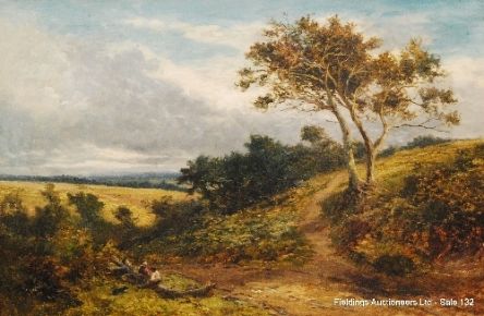 | Spring time scene with figures seated beside a pathway with storm clouds gathering to the distance | |