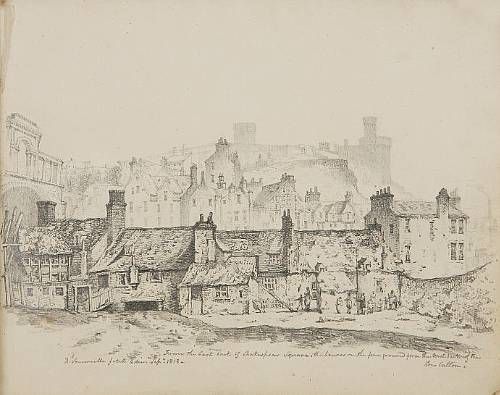 | A green leather-bound sketchbook containing 16 drawings, mostly topographical views of Edinburgh streets and architecture | |