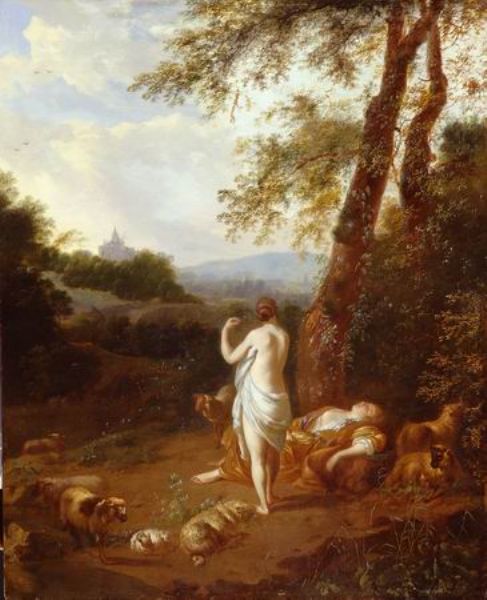 PAYSAGE BOISE AVEC UNE BAIGNEUSE ET UNE BERGERE ENDORMIE