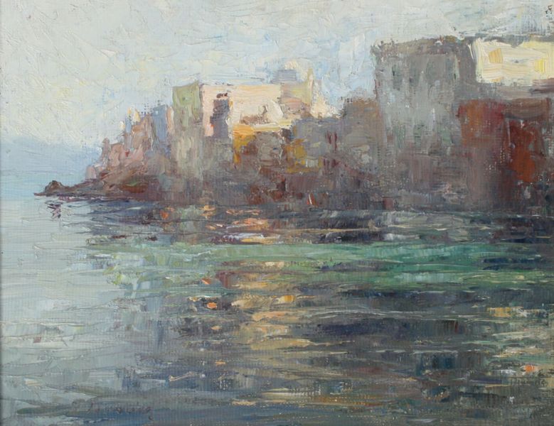 Two sided oil, Grecian coastal scene on one side, Village scene on the other