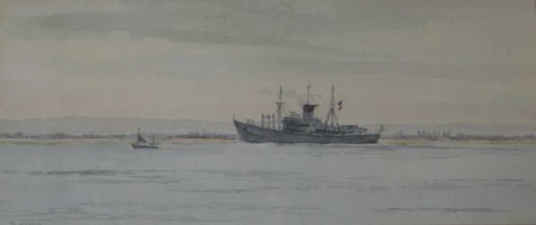Naval frigate and fishing boat in shallow waters