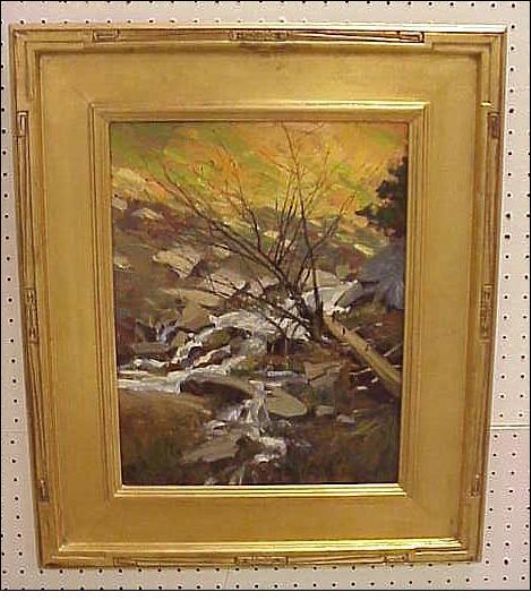 | impressionistic landscape with a brook passing over rocks in a wooded setting, | |