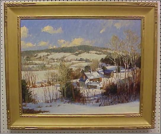 | impressionistic winter landscape with a farm in a hilly countrysid | |
