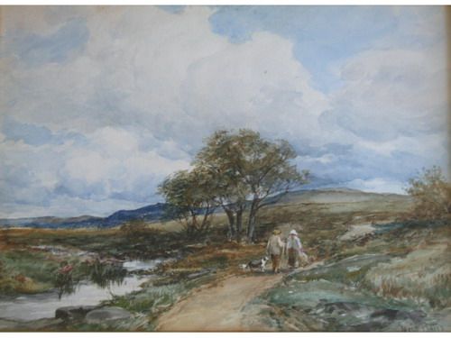 FIGURES AND A DOG ON A MOORLAND PATH