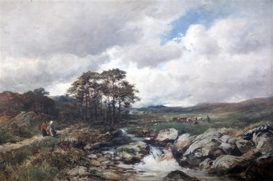 Highland landscape with figures on a lane and cattle in the distance