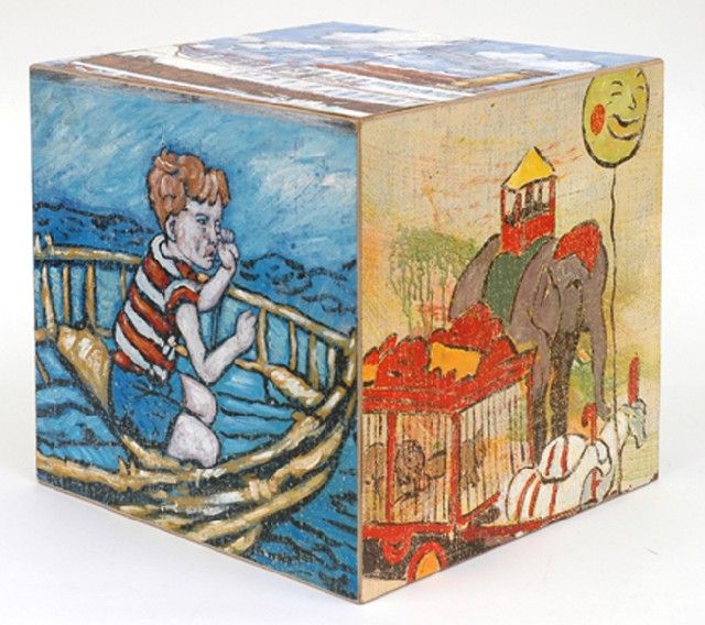 | Painted Cube depicting various scenes including an icecream, rooster, children playing, circus scene and a boat | |