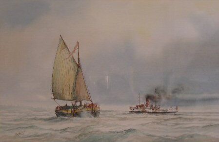 The Lincoln castle and barge in full sail on rough seas