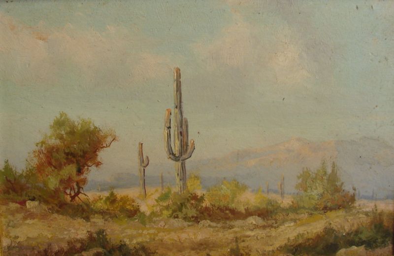 | Southwestern landscape with cactus, bushes and mountains in distance | |
