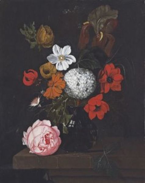 | Corn poppies, a peony, a chrysanthemum and other flowers, in a glass vase on a stone ledge | |