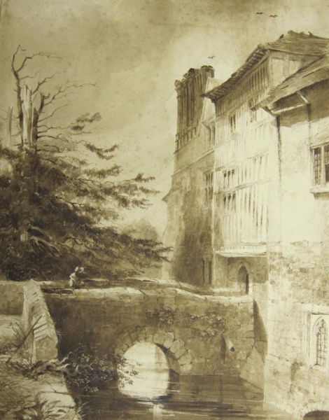 A Figure on a Footbridge, by the entrance of a country House, sepia wash