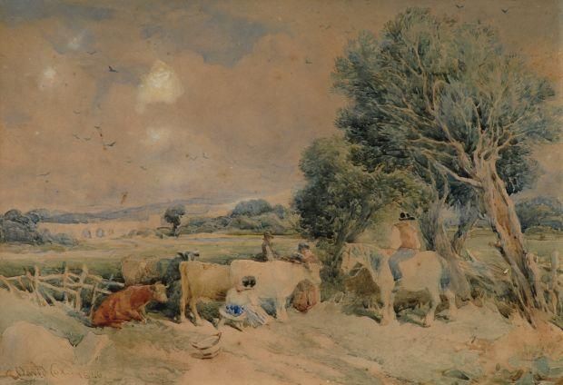 | A maid milking cattle, a horseman in the foreground landscape with bridge beyond | |