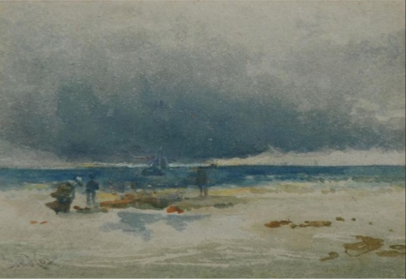 Beach scene with figures beneath lowering storm clouds