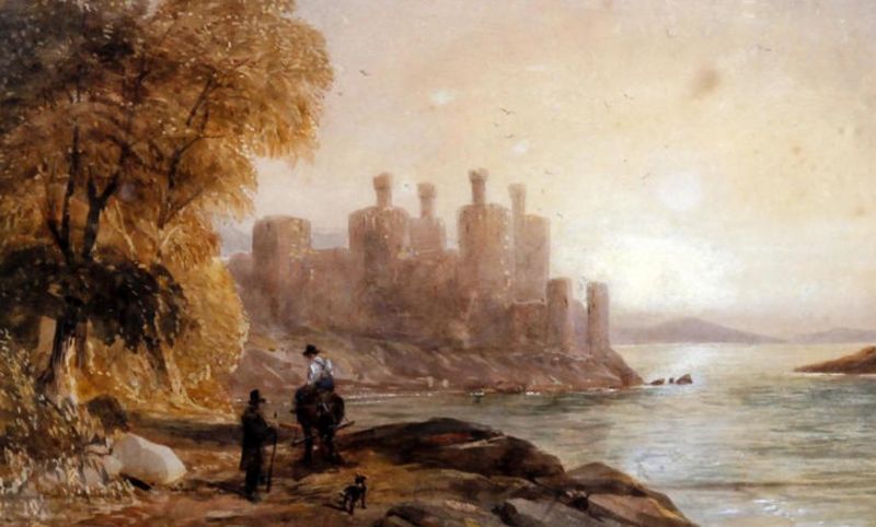 Caernarvon Castle at dusk with travellers and dog on a pathway before