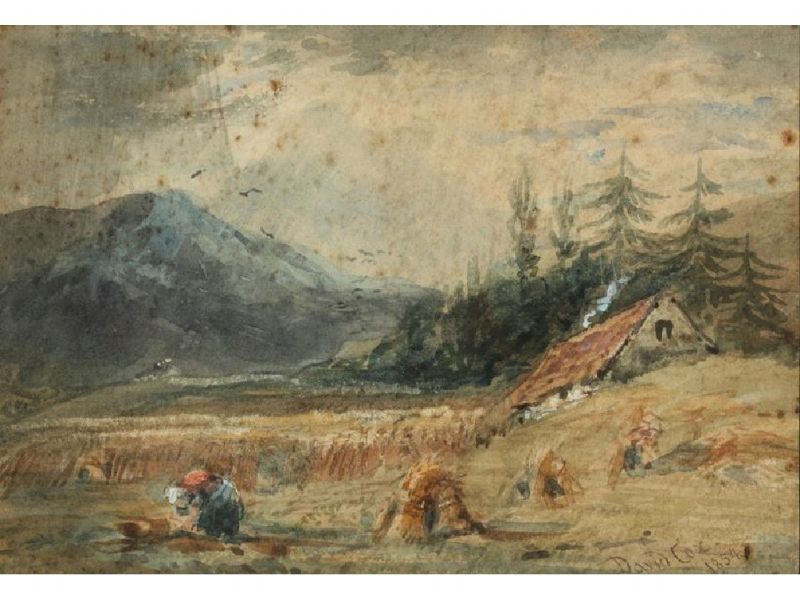 Mountainous landscape with cottage, figures and corn stukes to the foreground