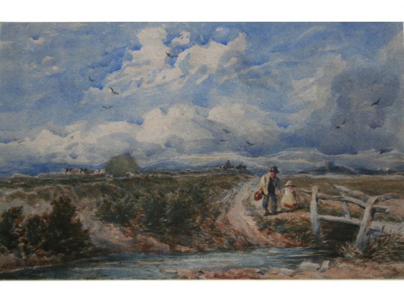 TWO FIGURES NEAR A COUNTRY BRIDGE, HAYMAKING BEYOND