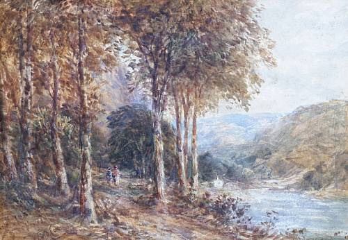 'Figures on a riverside woodland path'