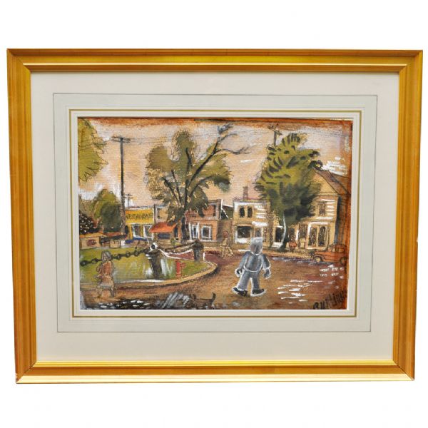 Stadsmotiv med folkliv och träd