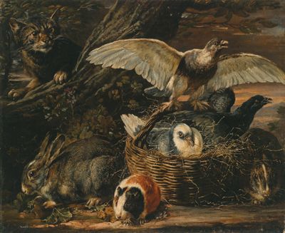 | A rabbit and a guinea pig near a basket with birds and a falcon, observed by a cat | |