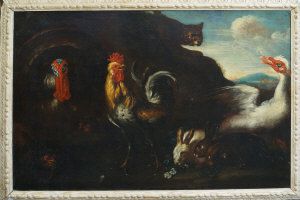 A cockerel, rabbits, a turkey, a goose alarmed by a cat
