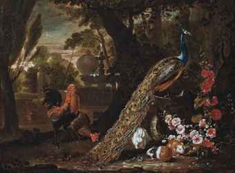| A peacock and cockerels, with guinea pigs and a rabbit, in a wooded park | |