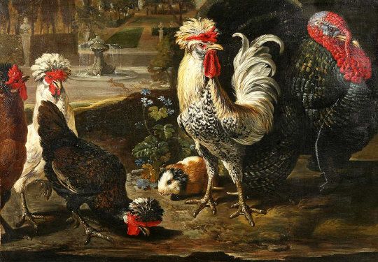 | Turkey, Hens, Cockerel & Guinea Pig by a faunal garden with hare crossing by a fountain | |