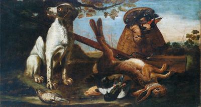 Game guarded by a dog in a landscape