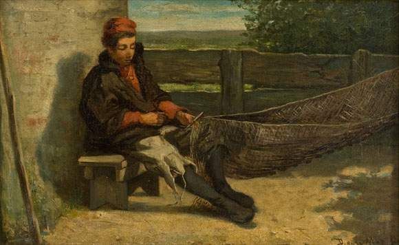 Fischerjunge beim Flicken des Netzes