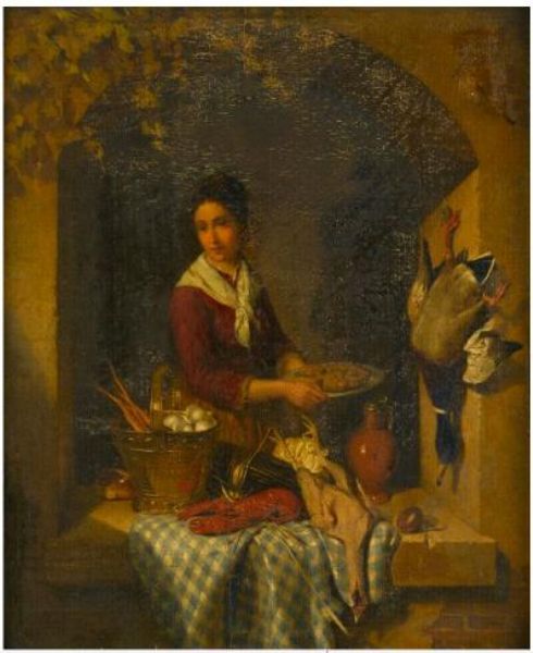 WOMAN WITH TRAY, LOBSTER, EGGS AND FOWL AT A CASEMENT