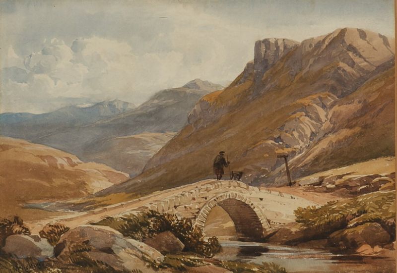 A SCOTSMAN AND HIS DOG ON A STONE BRIDGE