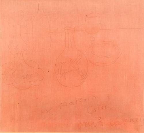 | Still life sketch of a wine carafe, wine glass, candlestick and a bottle | |