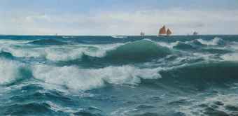| Waves breaking in shallow waters with boats off to the fishing grounds beyond | |