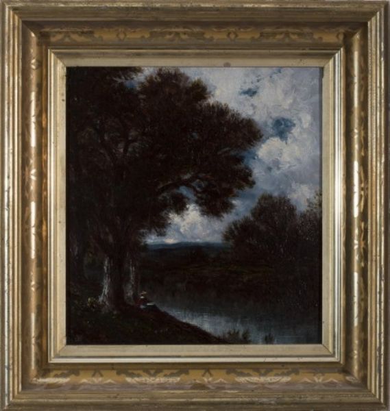 FIGURE SITTING UNDER A TREE BY A STREAM