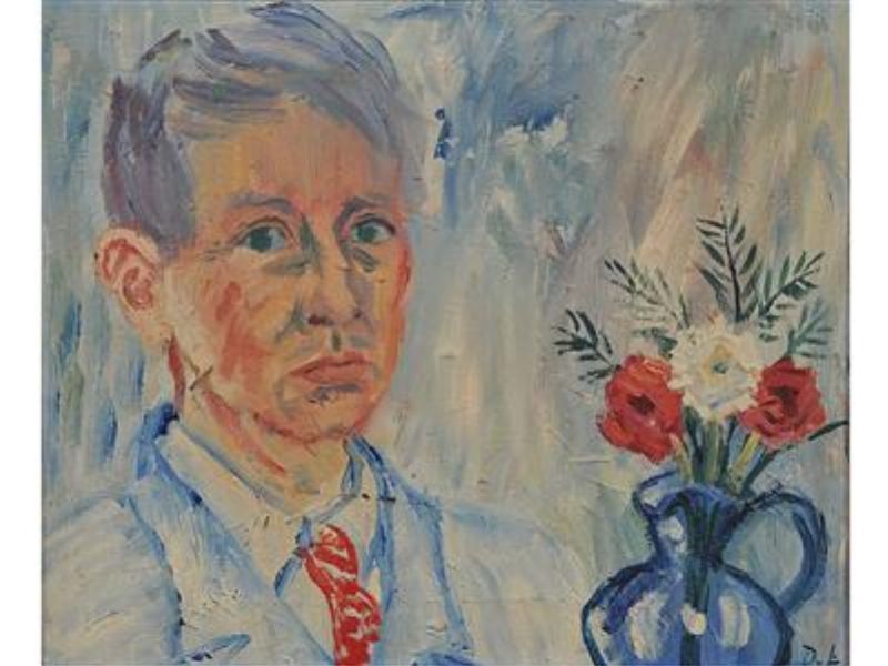 Självporträtt vid blomma.