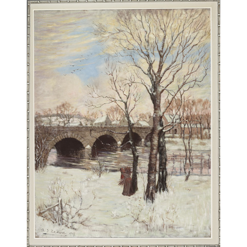 CARRYING KINDLING ALONG A FROZEN VILLAGE CANAL