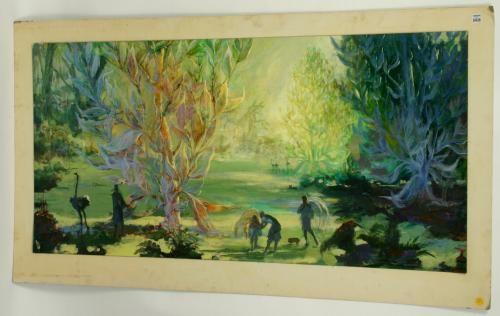 original movie illustration, landscape with animals and figures