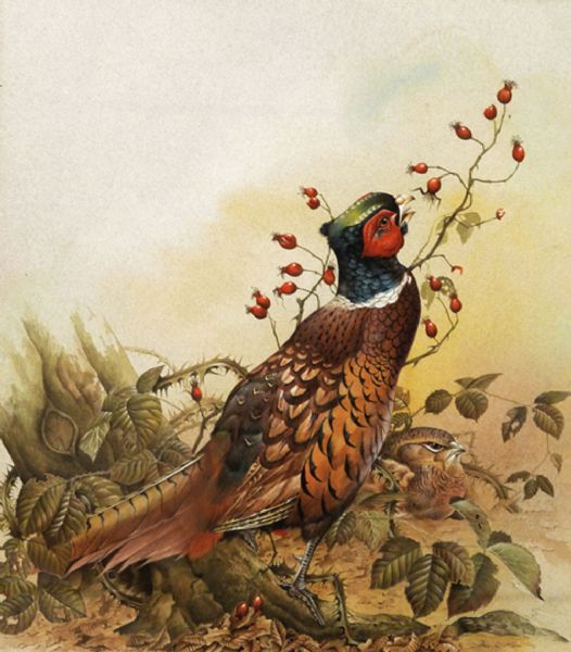 A COCK AND A HEN PHEASANT WITH BERRIES