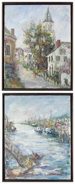 | the first depicting a New England harbor scene, the second depicting a charming New England street scene dominated by a white st | |