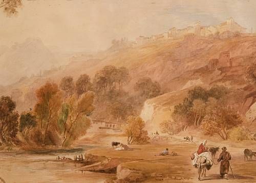 Figures and cattle below a walled town