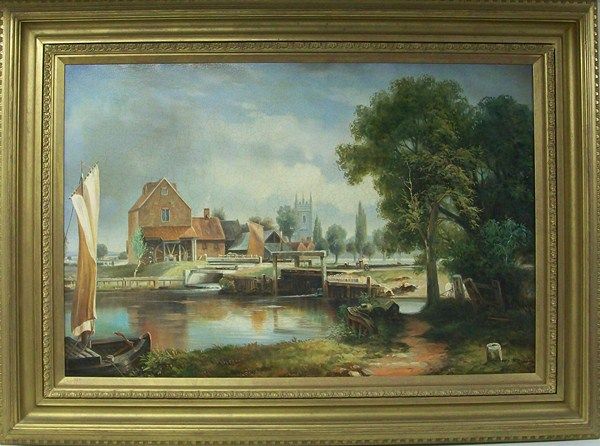 | A waterside landscape with barge to five weir behind and watermill with church in distance | |
