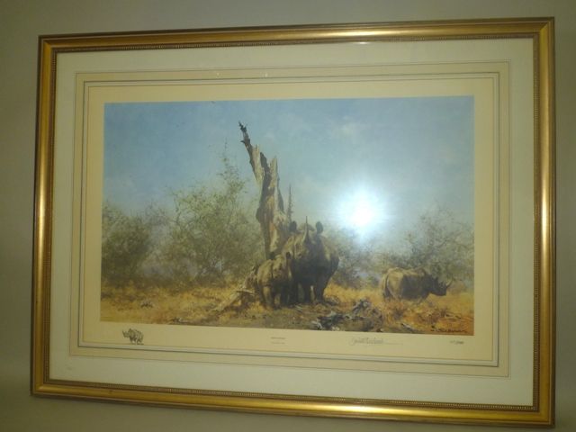 Rhino Beware, three beasts in scrubland by a wizened tree