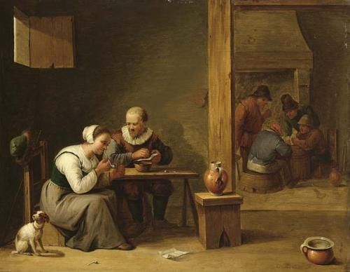 | A COUPLE SMOKING IN AN INN, OTHER PEASANTS PLAYING CARDS IN THE BACKGROUND NEAR A FIREPLACE | |