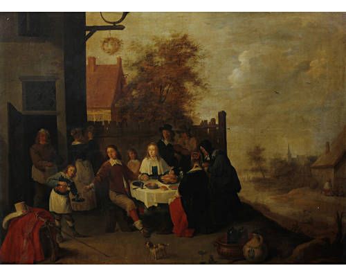 | Figures dining before a country inn, possibly a betrothal or wedding party bears initials 'D T' (lower left) | |
