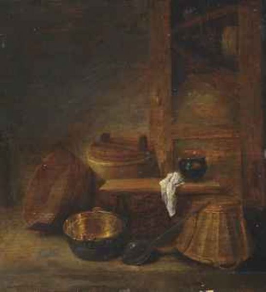| A barrel, an upturned basket, a ladle and a jug on a bench - a fragment | |