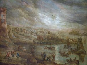 | Figures on a shore by a busy harbour with a ruin, cottages and a village beneath a moonlit sky | |