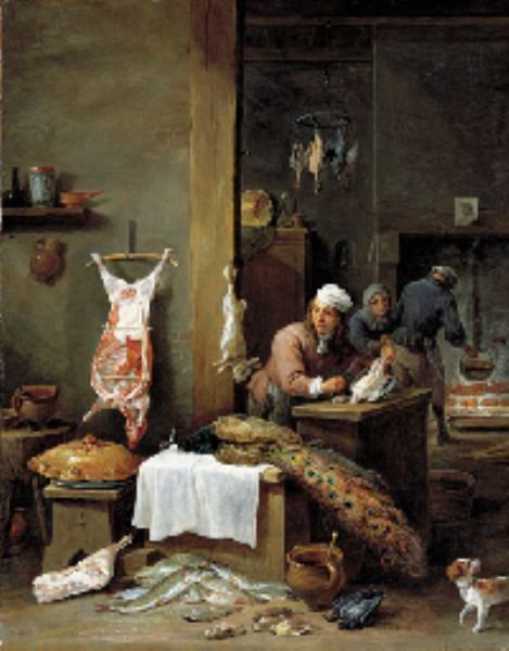 | Le Cuisinier Flamand: A kitchen interior with a cook preparing game at a table | |